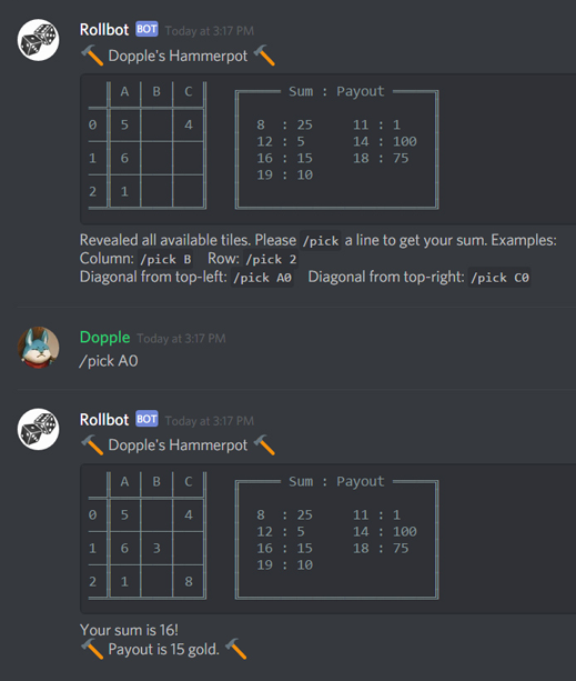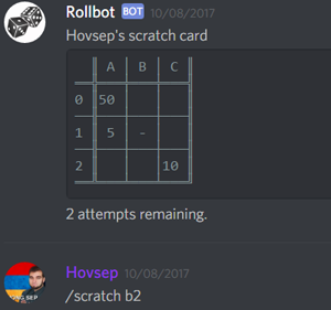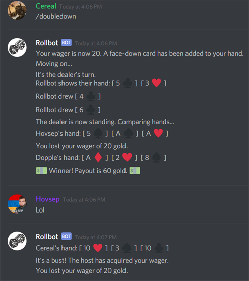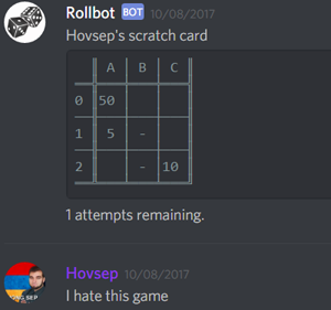 My friend and I thought it would be fun to program a bot with a suite of luck-based games. The arrangement was mutually beneficial: I got him started on Git, he helped me with Discord.py basics, and then I could swipe a copy of his repository and shovel stuff into it. (Later, he got into a group project, to which I said, "That's great, you can use your newfound Git skills!" He said, "Yeah, my Git 'skills'.")