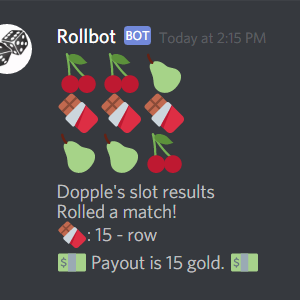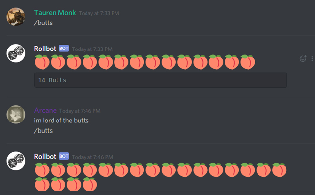 The most used command of Rollbot commands, all this does is print out a random number of peach emotes from 1-20.